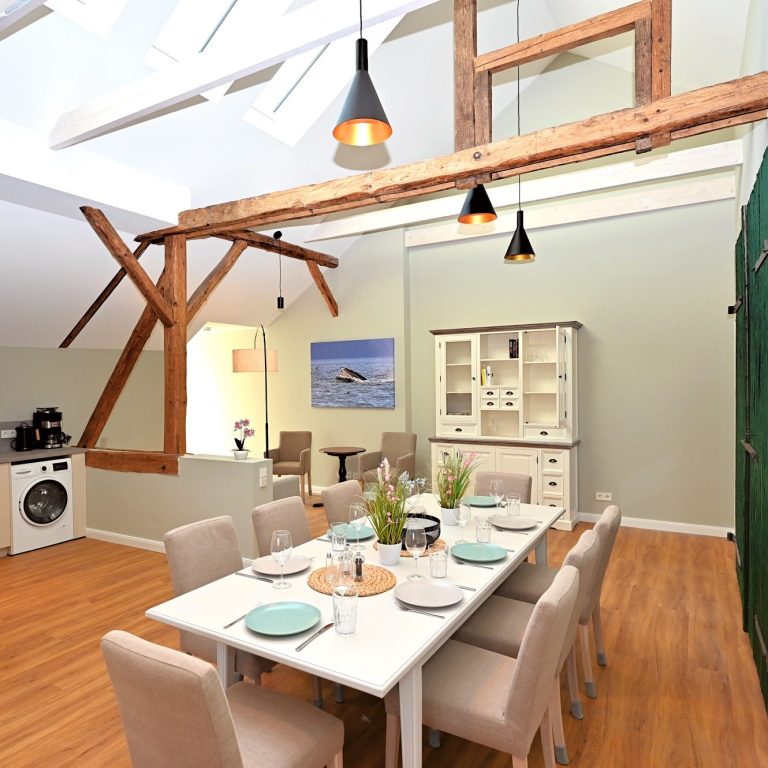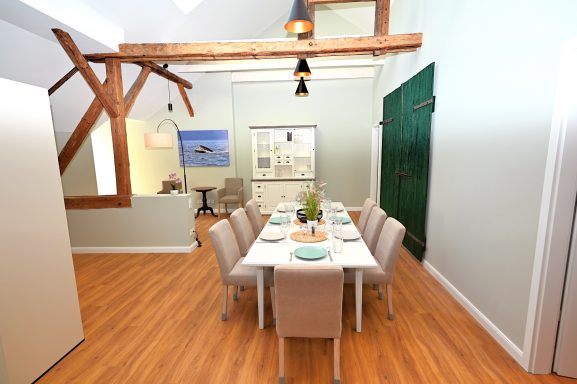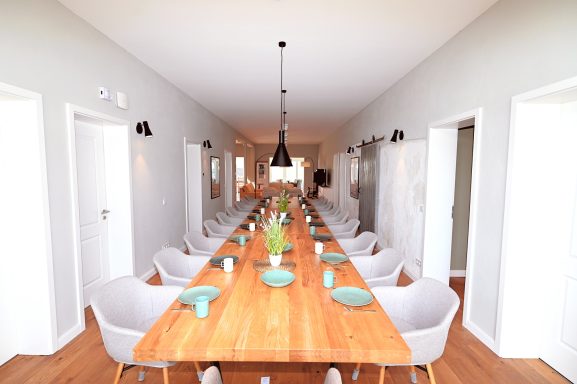 Zusätzlich gibt es einen großen Esstisch an den bis zu 24 Personen passen.