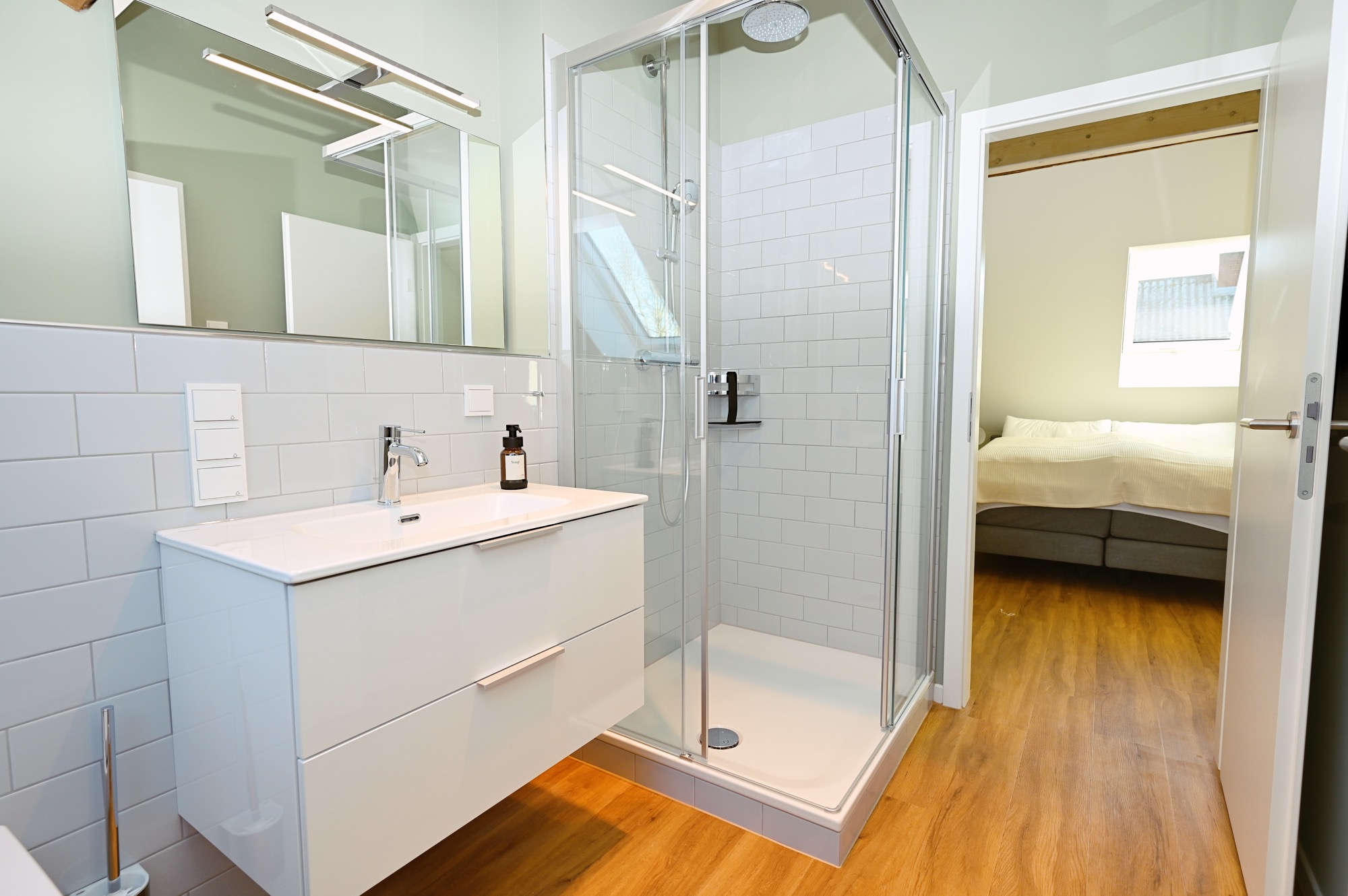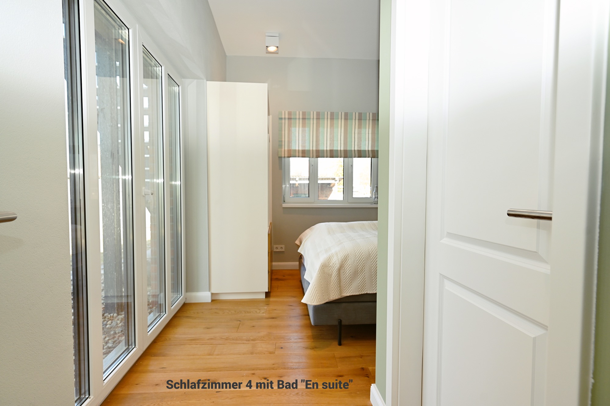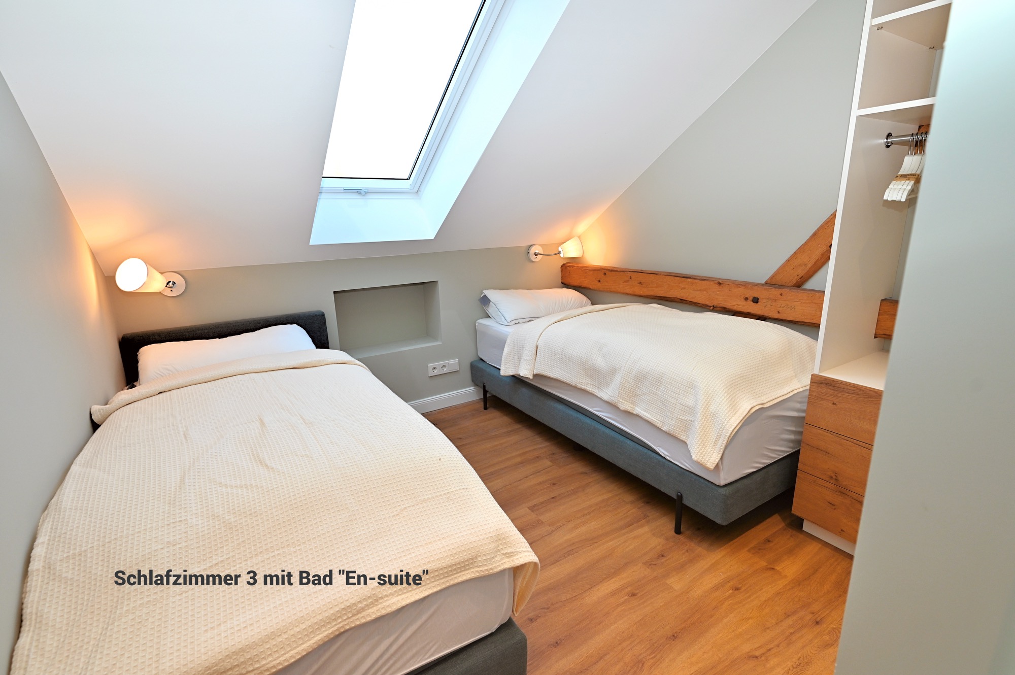 Das Appartement 4 befindet sich im 1. Stock und verfügt über insgesamt 5 Zimmer mit 4 Schlafzimmern, 3 Badezimmern und Schlafmöglichkeiten für bis zu 8 Personen. Damit eignet sie sich besonders gut für Familien oder gemeinsam reisende Erwachsene.